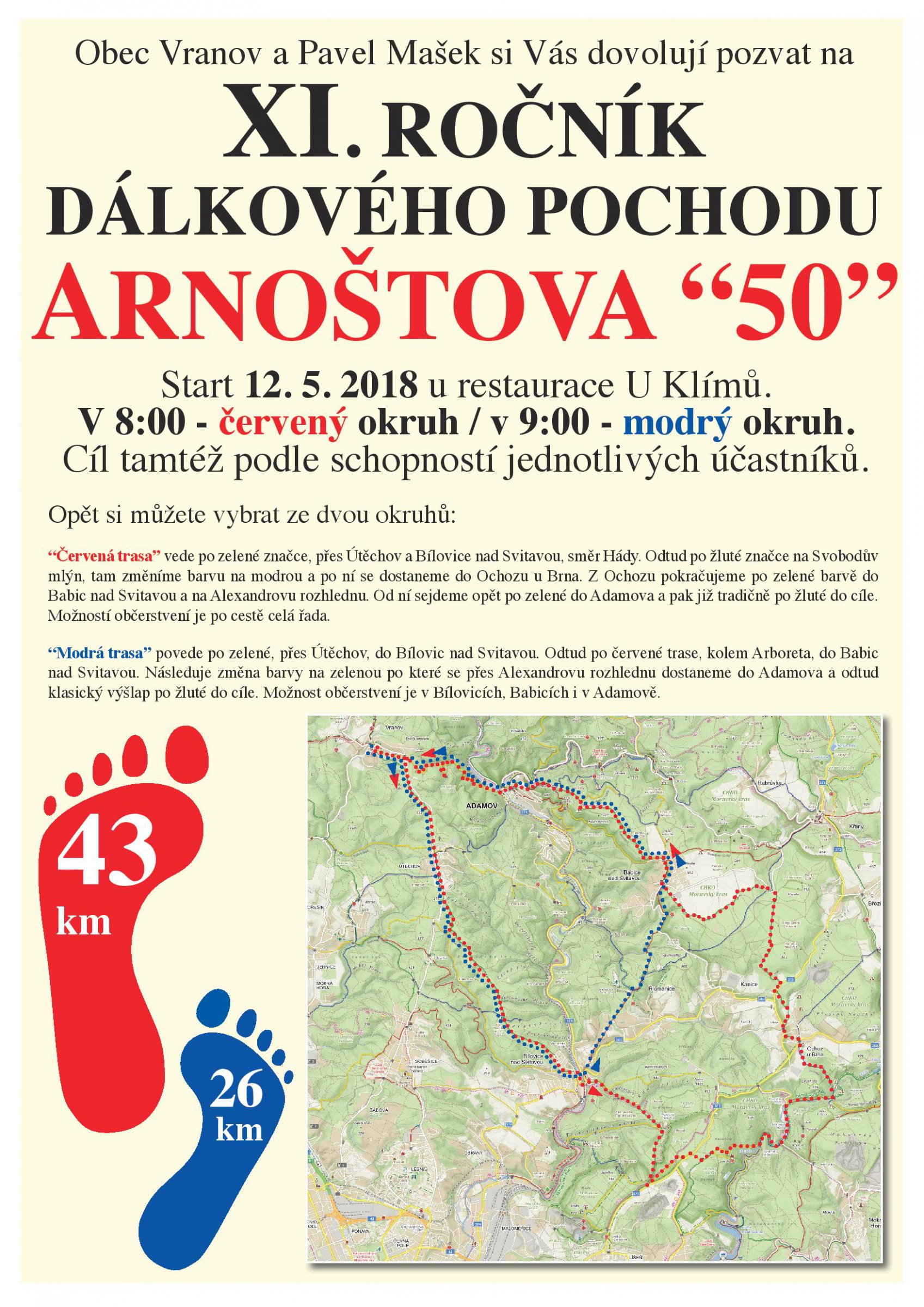 Ve spolupráci s pořadateli Arnoštovy padesátky zveme všechny příznivce turistiky a piva na výšlap. Kupte si v Restauraci u Klímů PET lahev Vranovského knížecího na cestu a vyrazte s námi v sobotu 12.5. v 8:00 na trasu 43 km nebo v 9:00 na trasu 26 km. V obou případech sraz v daný čas před Restaurací U Klímů.